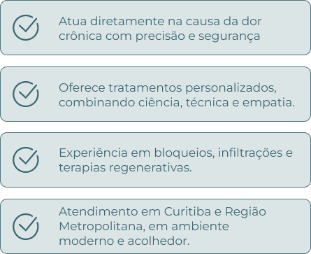 Com experiência em bloqueios anestésicos e infiltrações guiadas, atua de forma técnica e precisa, sempre priorizando segurança, transparência e acolhimento.
